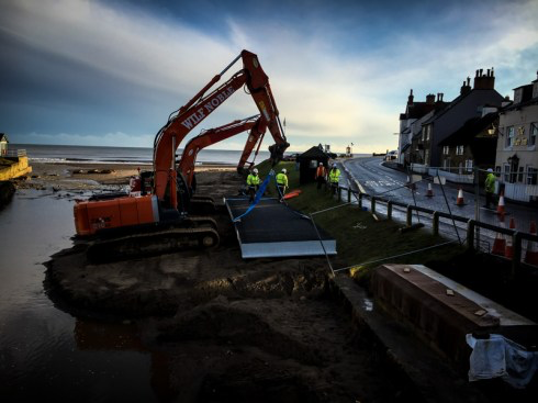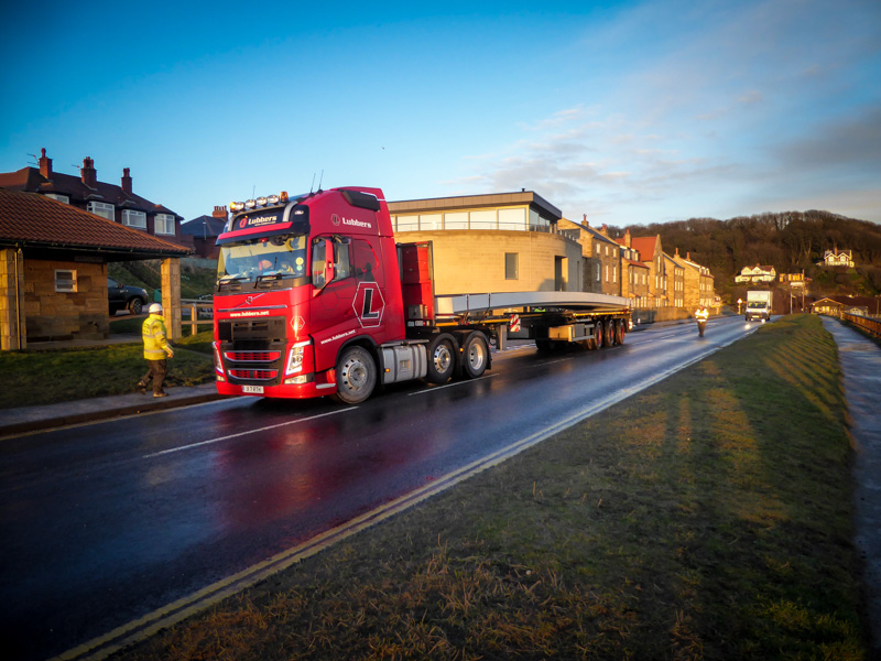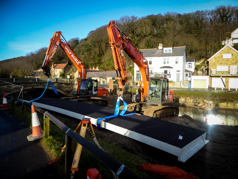 The deck weight was 6700 Kg and the parapet weight was 1200 Kg which is significantly less than a traditional steel bridge. This eliminated the need to close the road through the village for a crane lift. The bridge deck was delivered to site complete with surfacing in February 2017 along with the parapet. The installation contractor was able to quickly lift the bridge from the delivery lorry on to a sand berm using two excavators. The parapet was fitted and the bridge lowered into position the following day.