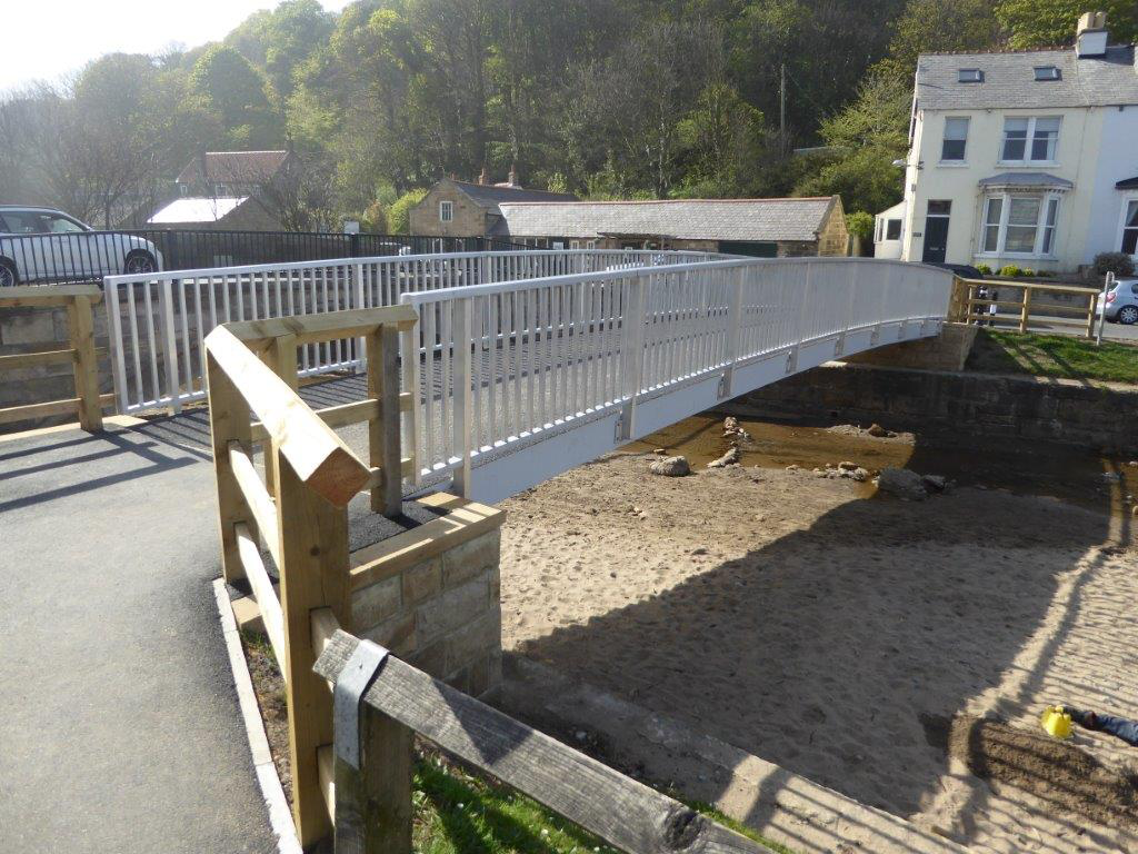 This bridge is located in Sandsend which is a small fishing village north of Whitby in a conservation area. It is a popular tourist attraction in the summer with award winning beaches. To cross the Sandsend Beck in the village pedestrians had to use a narrow stone road bridge which was not a safe arrangement so North Yorkshire County Council decided to install a new foot and cycleway bridge downstream of the road bridge.